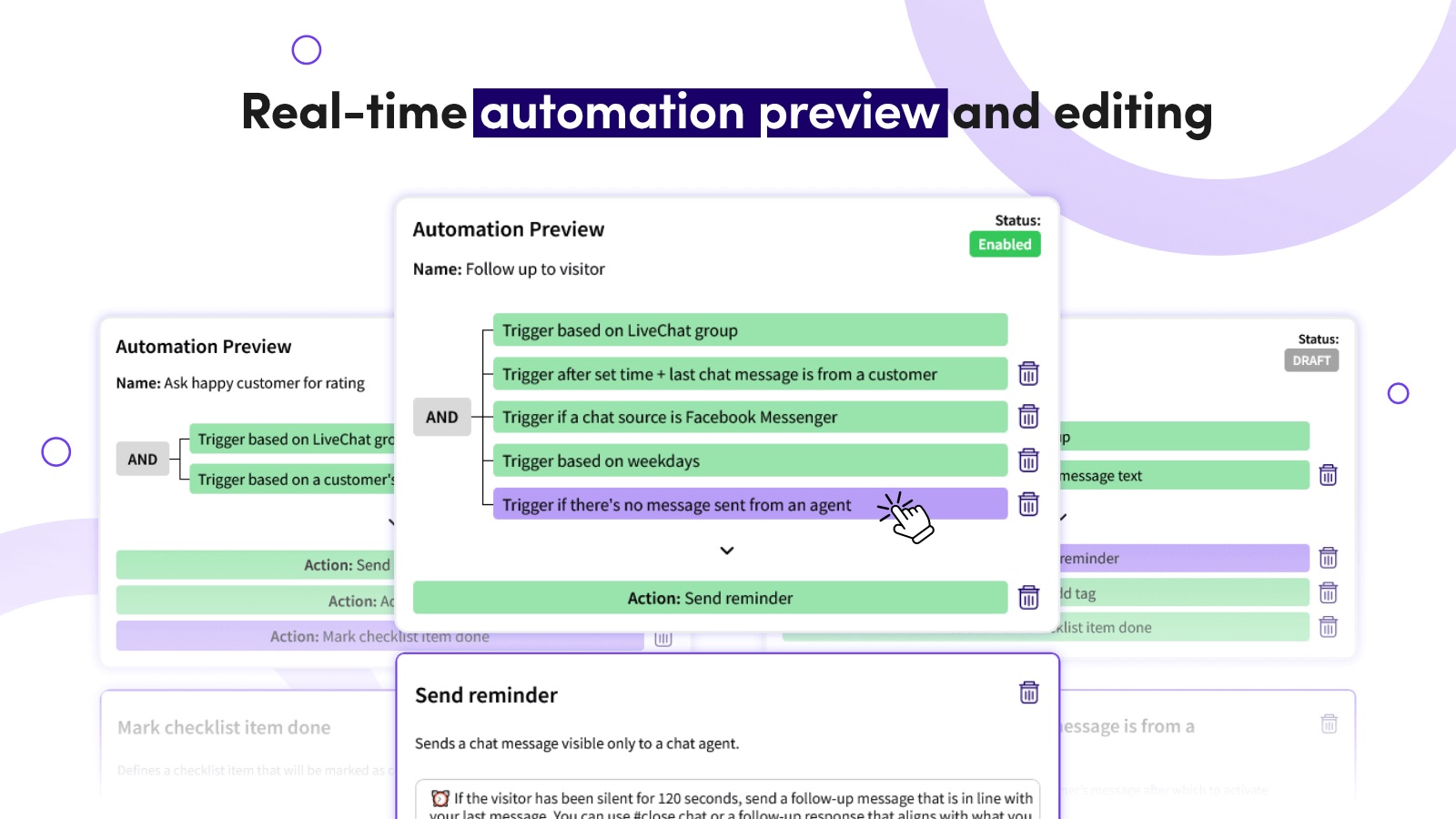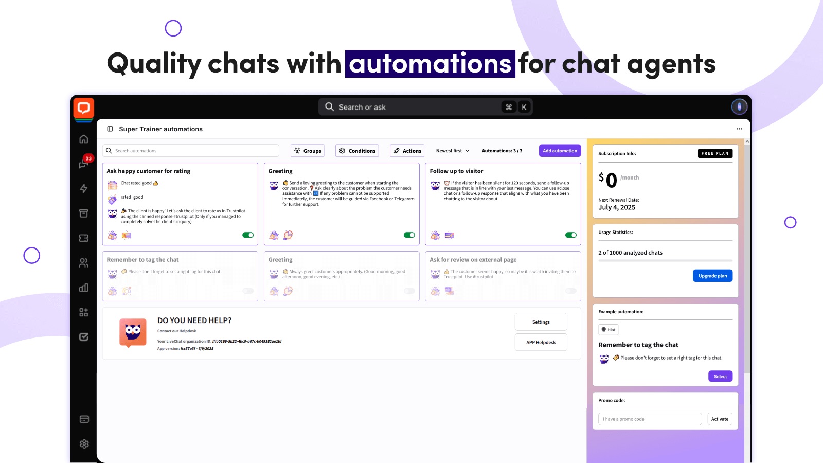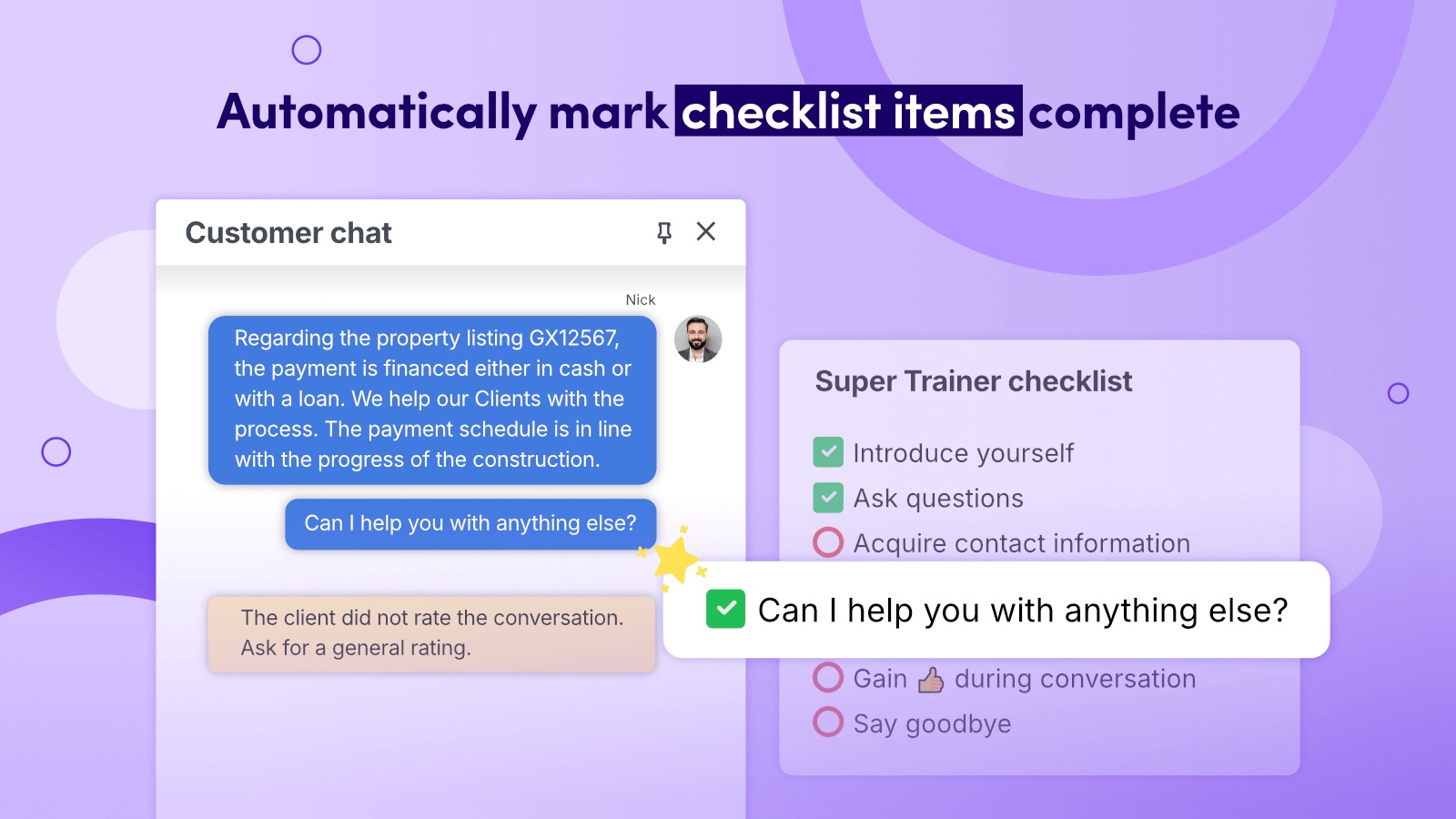 Super Trainer is an automatic coach that boosts team performance by automating reminders for agents and updating to-do checklists automatically during chats. It uses flexible automation built from conditions (triggers) and actions (outcomes).