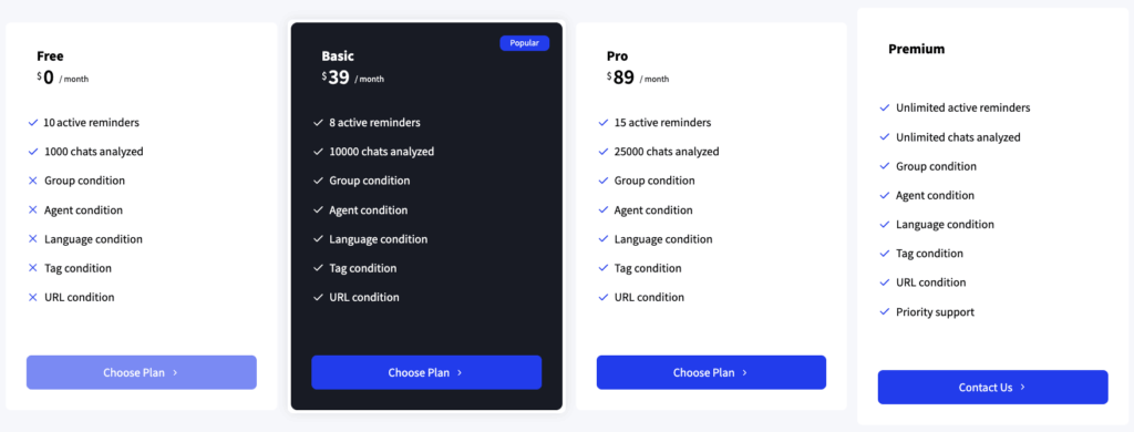 Optional monthly paid plans offer the possibility to set more automations, use paid conditions, and have a higher analyzed chat limit. There are also one-time packages available that increase the analyzed chat limits.